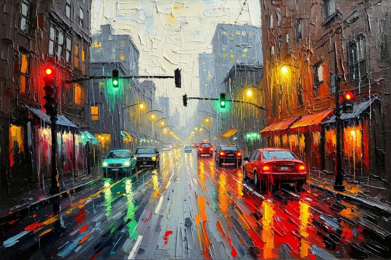 Lietus ne lijo. Jis krito ilgais, stikliniais pirštais, barbenančiais į stogus, palanges ir automobilių skardą, kurdamas tūkstančius skirtingų ritmų. Miestas, prieš akimirką buvęs pilkas ir pavargęs, virto milžiniška akvarele. Šviesoforų signalai ištirpo ant šlapio asfalto, palikdami raudonas ir žalias kraujo dėmes. Gatvės žibintų šviesa suskystėjo, virto drebančiais aukso stulpais.